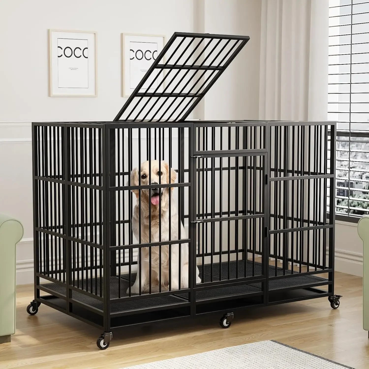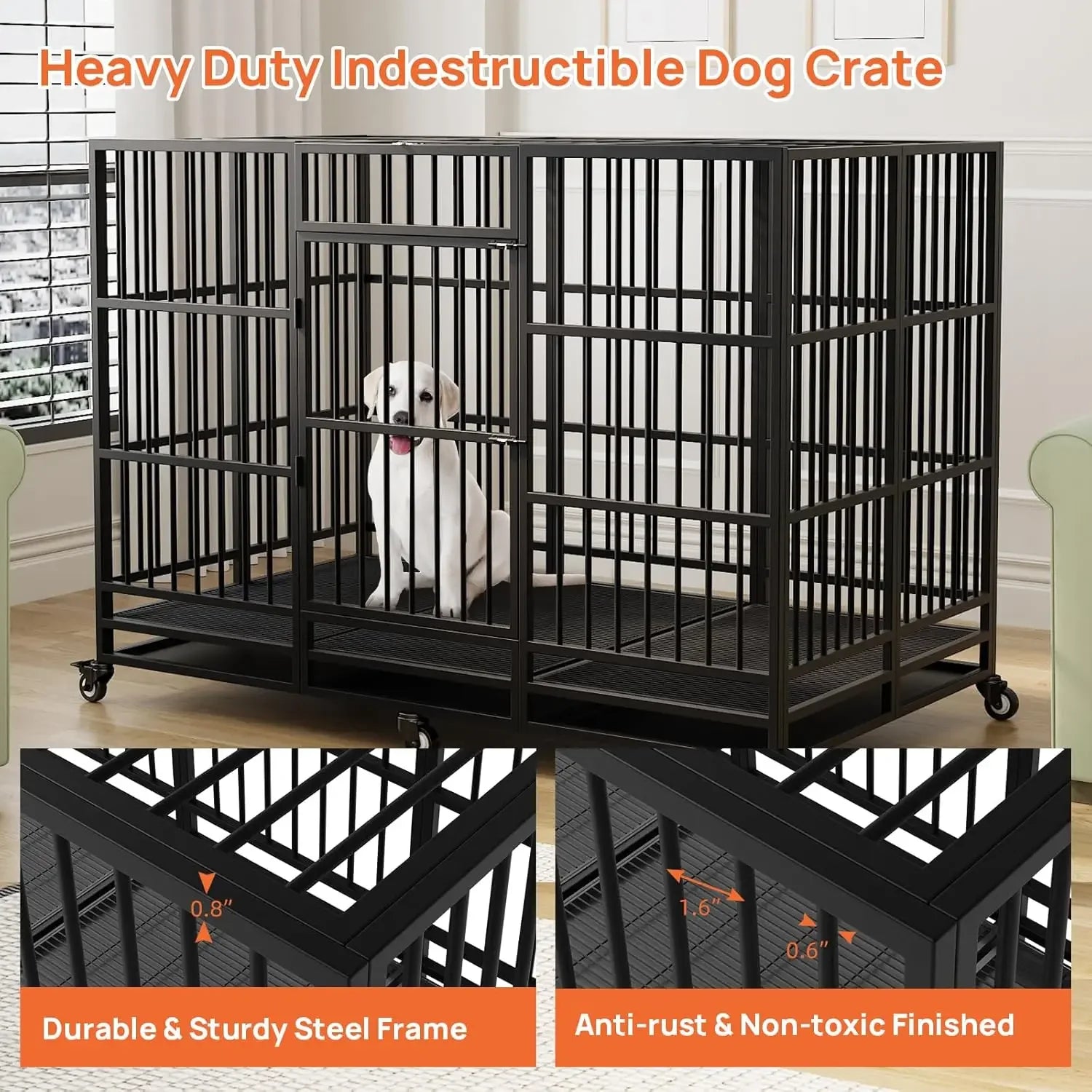 63 Inch Large Heavy Duty Dog Crate with Lockable Wheels Removable Tray, Large Dog Kennel for Large Dog Indoor Outdoor, Black